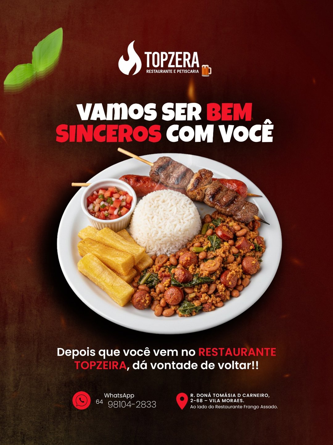O Topzera Restaurante e Petiscaria é referência em almoço, marmita e jantinha em Caldas Novas, especialmente para quem busca comida caseira de verdade no Centro e bairros próximos. Somos um restaurante popular com chef formado e certificado, oferecendo almoço self-service com sabor caseiro, carnes grelhadas na chapa, picanha, marmitas bem servidas e jantinha caprichada, ideais para quem precisa comer bem e rápido no horário de almoço. No período da noite, o Topzera também funciona como petiscaria em Caldas Novas, com porções generosas, petiscos irresistíveis, chopp gelado, caipirinhas especiais, música ao vivo e transmissão de jogos, em um ambiente descontraído para reunir amigos e família. 📍 Localização fácil no Centro de Caldas Novas